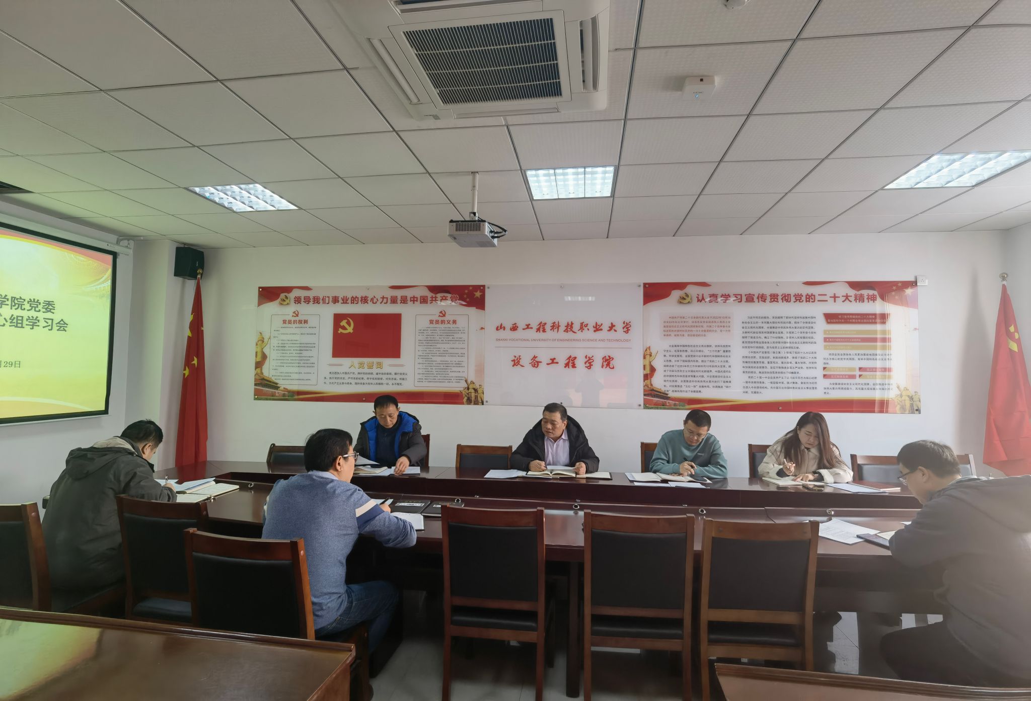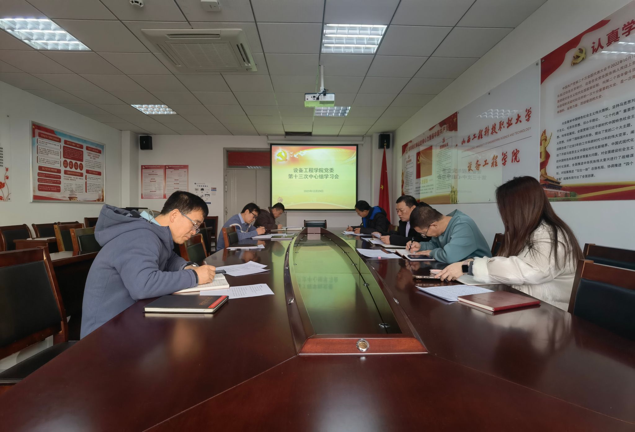 12月29日上午,设备工程学院党委在一号教学楼601会议室召开第13次党委理论学习中心组学习会,学习习近平总书记在纪念毛泽东同志诞辰130周年座谈会上的重要讲话精神,传达山西省委十二届七次全体会议暨山西省委经济工作会议的精神。会议由学院党委书记丁俊发主持。