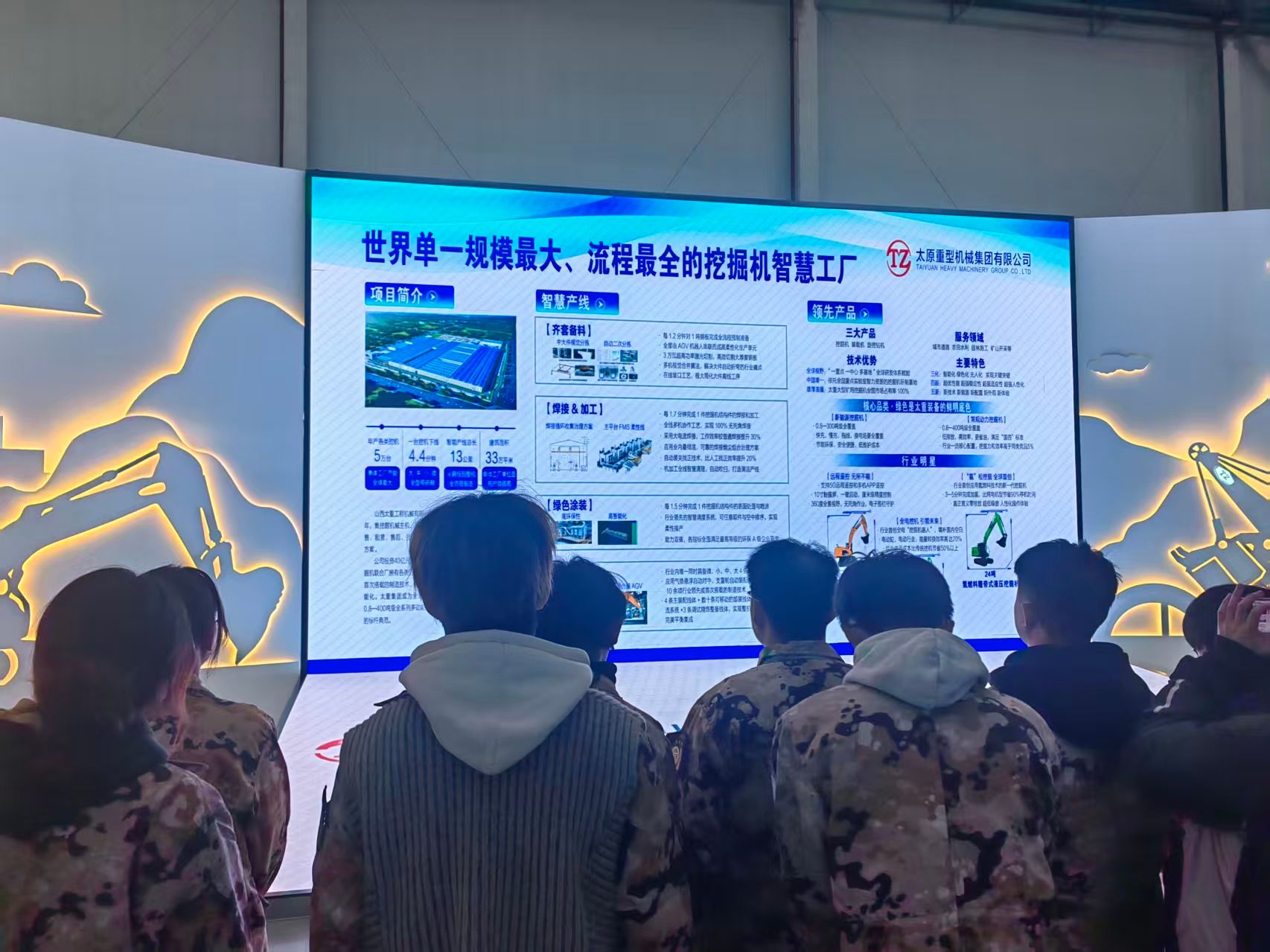 在机械设备、智能制造等产业领域,太重高端智能装备产业园区作为行业的佼佼者,汇聚了众多前沿的智能制造技术与产品,其自动化寻优匹配、智能挖掘机器人、超视距精准控制、多样化绿色补能、氢燃料电池动力等多个技术均实现了原创突破、巅峰起步的发展。在实习期间,同学们在园区技术人员的专业引领下,深入挖掘机装配生产车间一线与展示中心参观,近距离接触各类工业机器人、智能装备以及生产线相关工艺。园区培训中心的闫老师等技术工程师为学生们详细讲解了各款机器人产品在太重挖掘机装配过程中的应用,包括智能备料、焊接机加、绿色涂装和极致装调,并从功能特性、性能参数、应用场景以及未来发展趋势等多个角度进行了介绍。