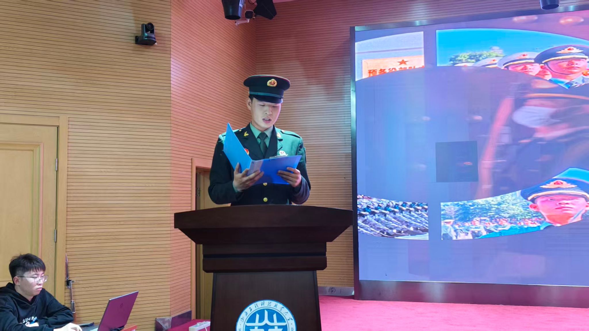 动员大会现场气氛庄重热烈,曾光荣参与纪念中国人民抗日战争暨世界反法西斯战争胜利 80 周年阅兵盛典的学院电气智能2405ZB班学生贾启钊,作为特邀代表走上讲台。他以亲身经历为切入点,用一个个鲜活生动、感人至深的阅兵细节,向新生们深刻诠释了 “阅兵精神”的内涵。他鼓励新同学们要以军训为契机,在高强度训练中磨炼意志品质、塑造坚毅品格,更要将军训中养成的自律意识、优良作风融入未来的学习与生活,为青春镌刻下奋斗的鲜明印记。