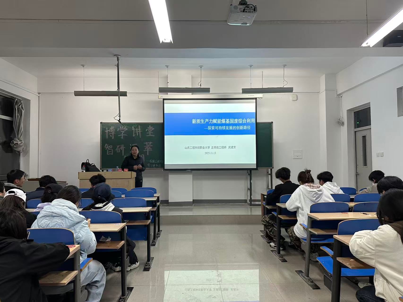 讲座中,武建芳老师围绕煤基固废综合利用的行业现状、技术瓶颈展开深度剖析,结合新质生产力的技术特性与应用场景,系统讲解了如何通过技术创新破解固废处理难题、推动传统煤炭产业绿色转型。她不仅分享了国内外相关领域的前沿科研成果与典型实践案例,还针对该方向的科研选题、职业发展路径进行细致解读,帮助同学们明晰专业学习与产业需求的结合点。