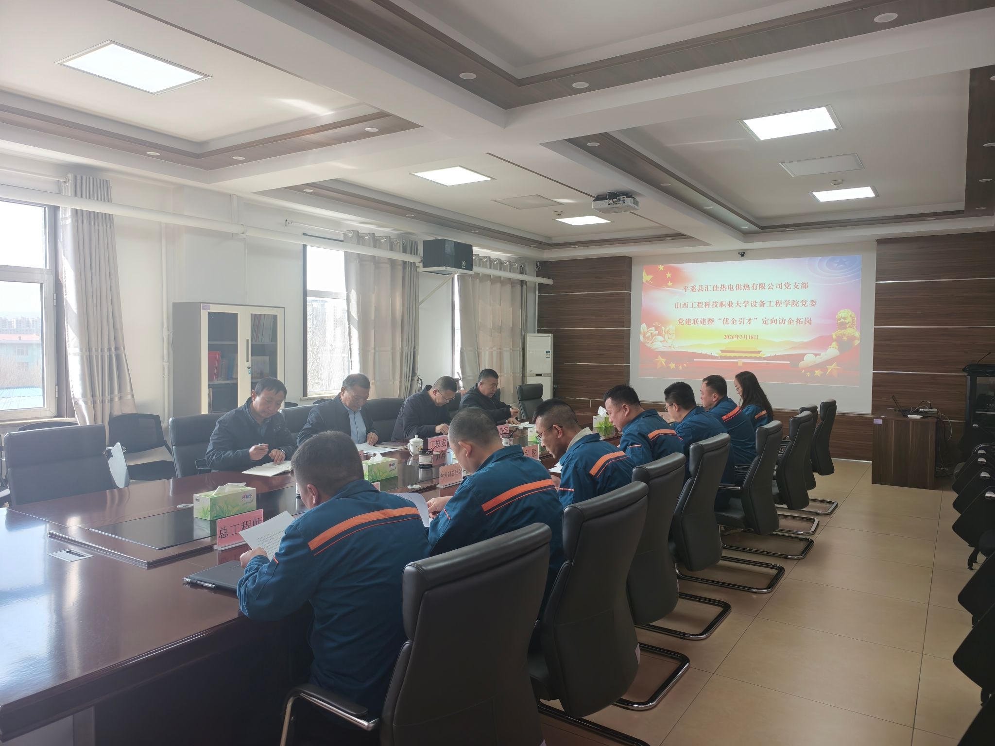 为深入贯彻落实《教育部办公厅关于开展“优企进校 招才引智”专项行动的通知》要求,切实发挥学院“党建+”工作模式的驱动作用,促进产教融合、校企协同育人,准确了解行业企业用人需求,进一步优化学院人才培养方案,拓宽学生就业渠道,3月18日上午,学院党委书记丁俊发,党委副书记、院长陕晋军,党委副书记高志勇,综合办副主任、专职组织员王仰兵一行4人赴平遥汇佳热电供热有限公司开展党建联建暨访企拓岗活动。